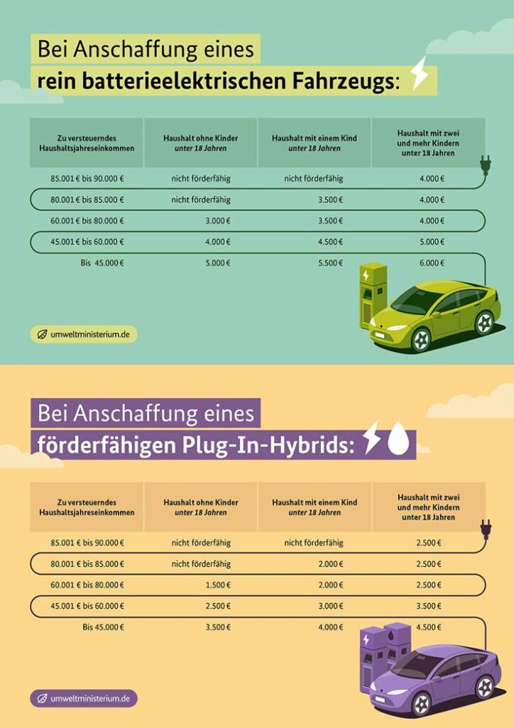 - Haushaltseinkommen bis 45.000 € = Prämie Elektro 5.000 €, bis 60.000 € = Prämie Elektro 4.000 €, bis 80.000 € = Prämie Elektro 3.000 €.